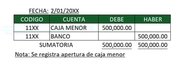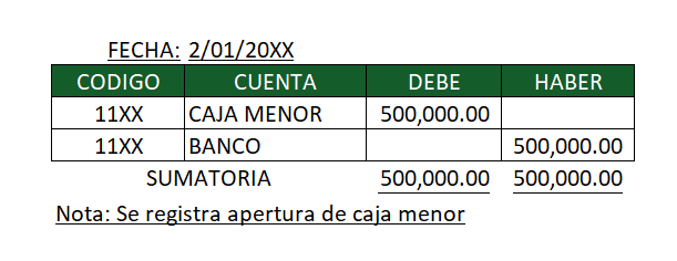 La apertura de la caja menor es un registro que se realiza una sola vez, y es al momento de la apertura de la caja, es un registro donde debitamos la caja menor a crear y acreditamos los fondos (en la mayoría de los casos banco) donde proviene el dinero para fondos de caja.