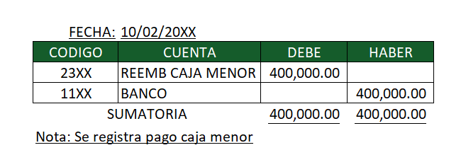 Ejemplo: Si tenemos una caja de 500.000, y por políticas cumplimos el 80% para su reembolso, registramos la causación de los gastos por 400.000y luego realizamos su pago de la misma, como se encuentra a continuación: